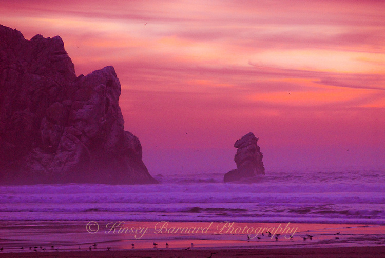 In evening skies of reds and blues