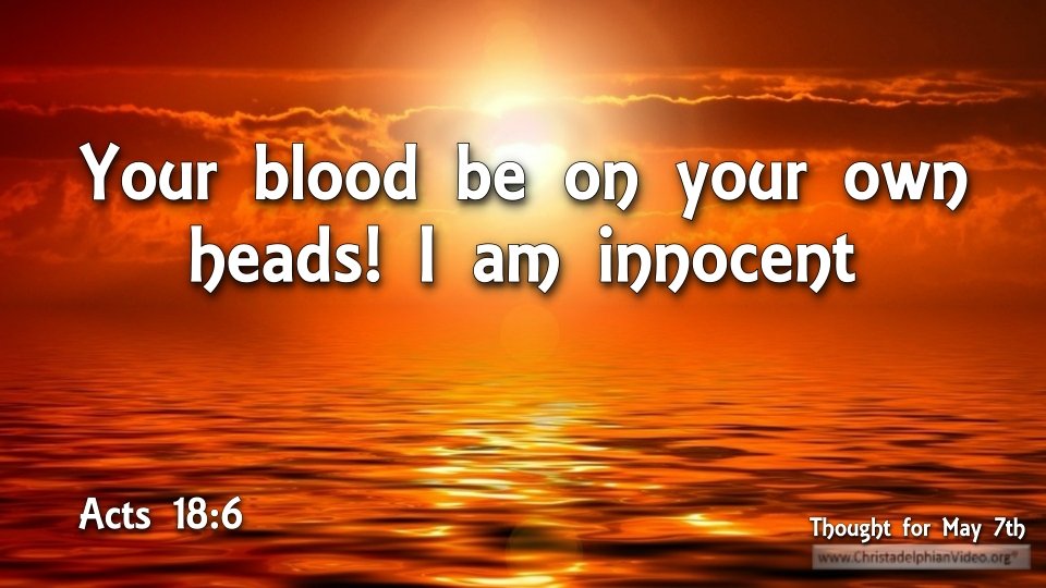 Act 18:6 And when they opposed themselves, and blasphemed, he shook his raiment, and said unto them, Your blood be upon your own heads; I am clean: from henceforth I will go unto the Gentiles.