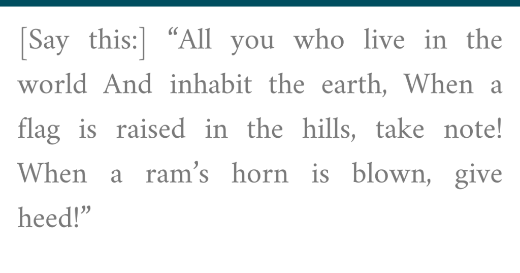 Isa 18:3 All ye inhabitants of the world, and dwellers on the earth, see ye, when he lifts up an banner on the mountains; and when he blows a trumpet, hear ye.