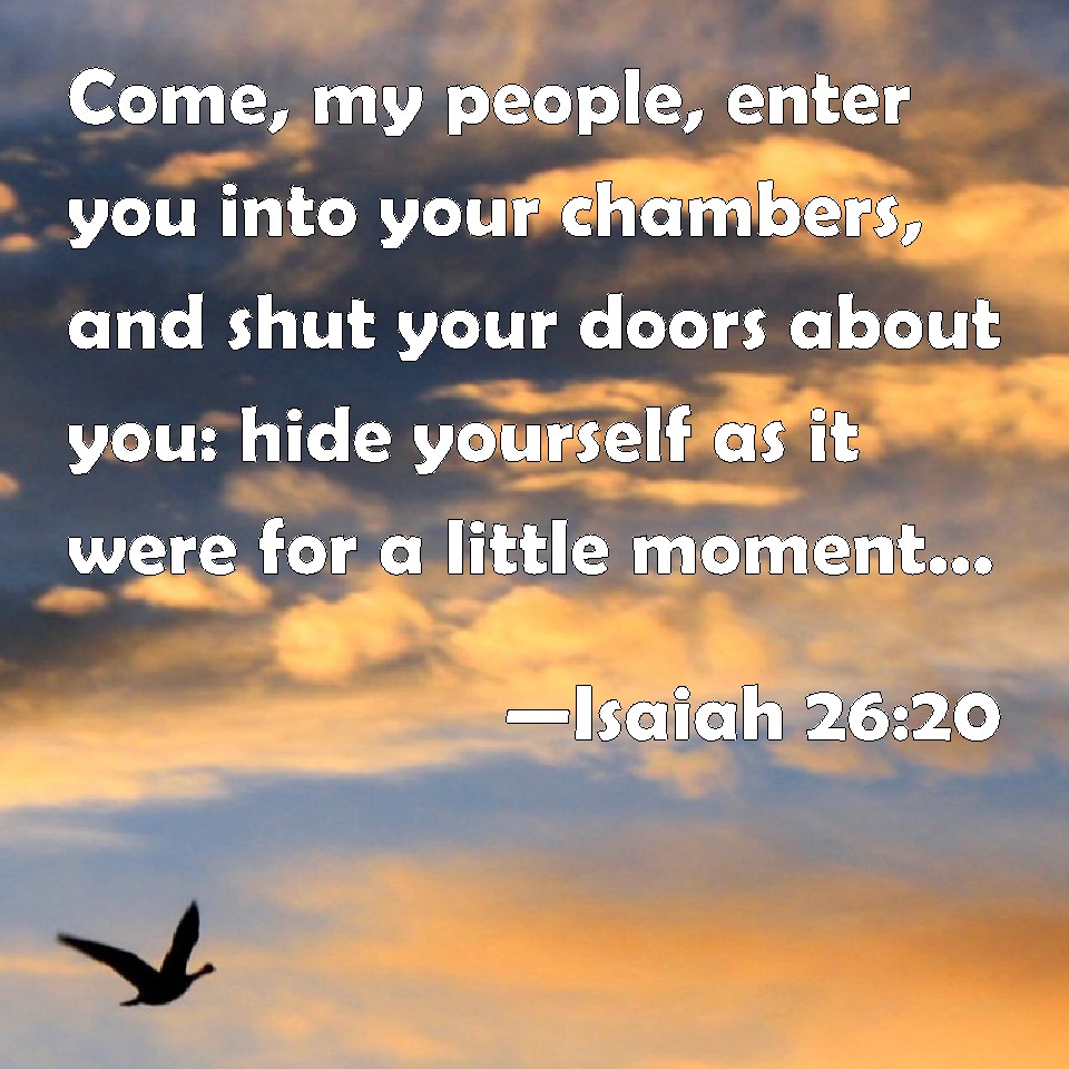 Isa 26:20 Come, my people, enter your chambers, and shut thy doors behind you.