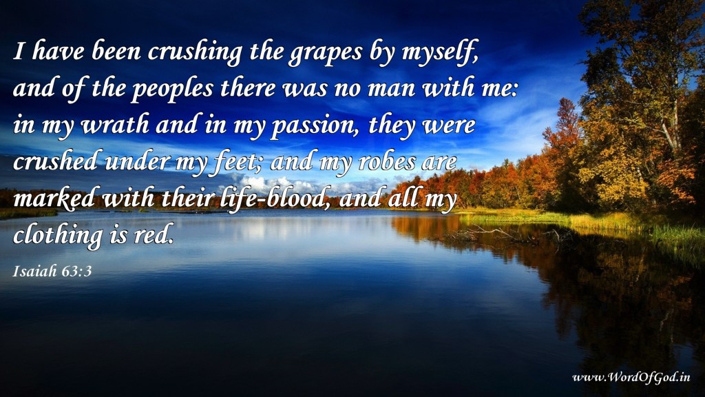 Isa 63:3 I have trodden the winepress alone; and of the people there was none with me: for I will tread them in mine anger, and trample them in my fury; and their blood shall be sprinkled upon my garments, and I will stain all my raiment.